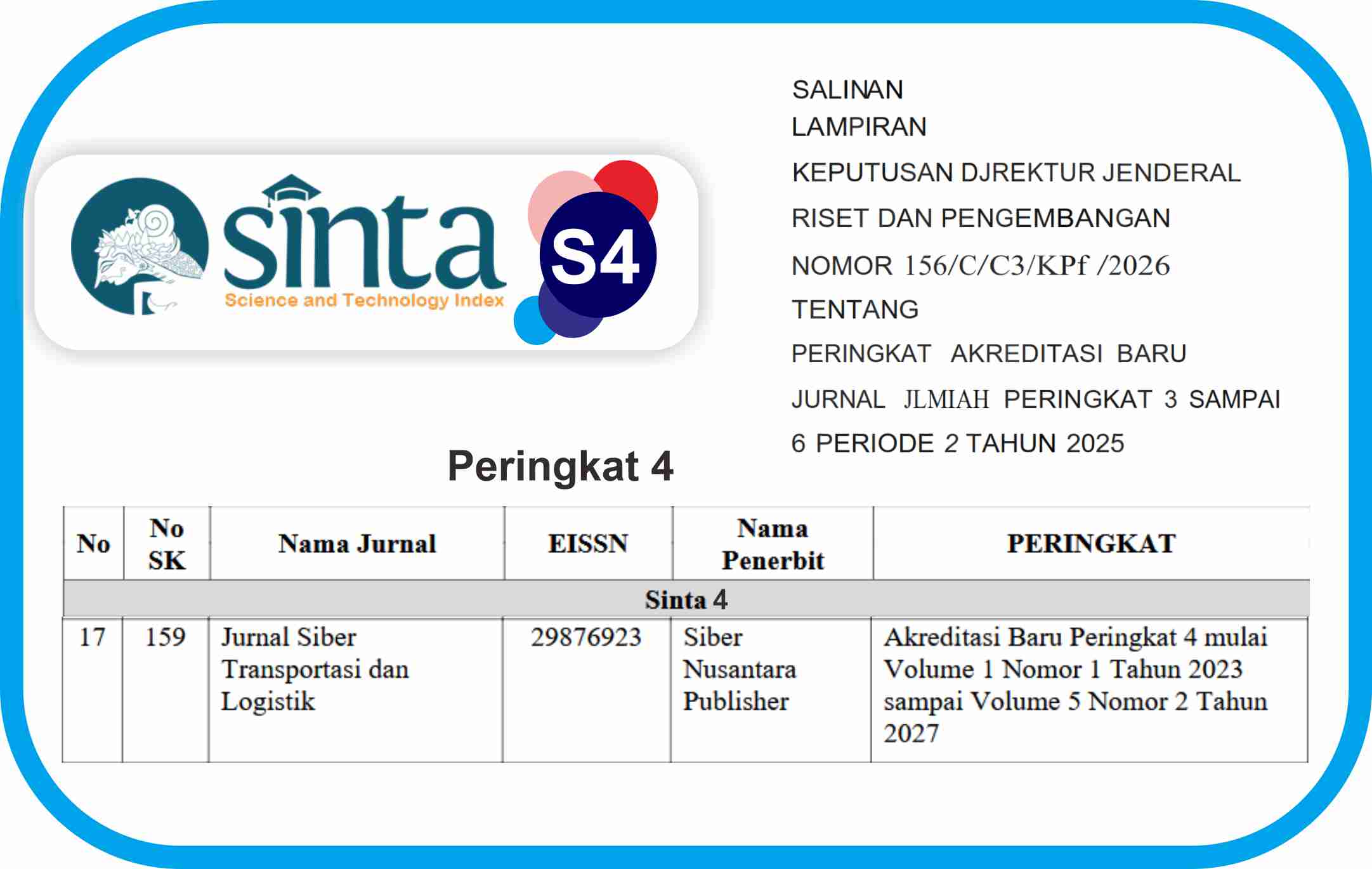 - Penulis mengakui bahwa Jurnal Siber Transportasi dan Logistik (JSTL) berhak menjadi yang pertama menerbitkan dengan lisensi Creative Commons Attribution 4.0 International (Attribution 4.0 International CC BY 4.0) .